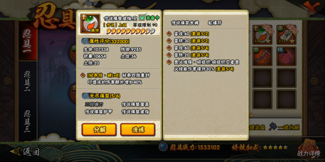 火影忍者90级开启的忍具系统=第二套装备!究·痛楚套雷属性一刀涨3万战,648直购/修罗团本掉,雷攻绿字5%真伤秒一切!详细内容跟着小编一起往下了解全部吧