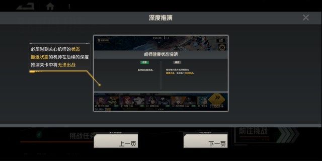 ●时刻注意麾下机师的状态,如果机师在战斗中不慎被击破,则在后续的深度推演关卡中将无法出战。