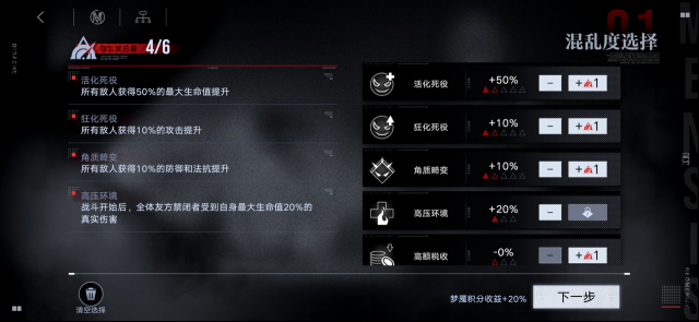 首次通关后,将开启混乱度系统。局长可在探索前自由选择混乱度词条,更高难度的挑战将带来更高效的收益。