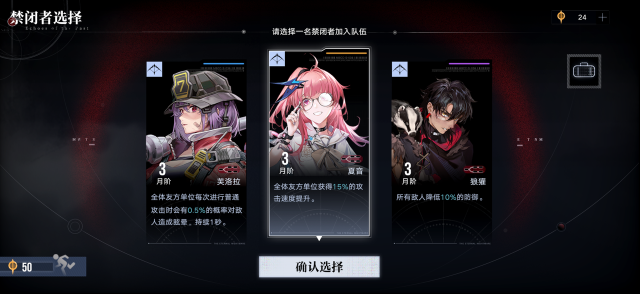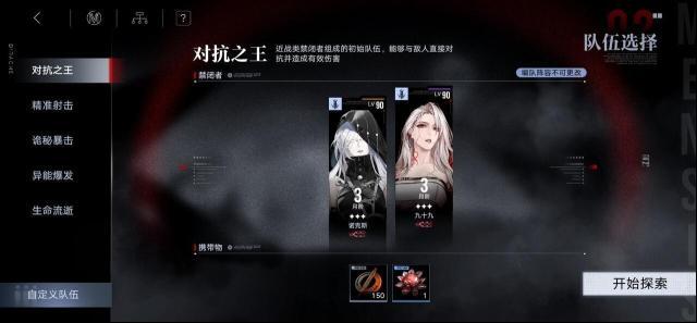 在开启探索后,局长可选择带领任意一支预设的禁闭者小队进行探索,也可使用局长已有的禁闭者进行自定义编队。每个禁闭者小队都拥有不同的作战风格与相对应的初始携带物,可为局长在作战时提供更多的助益。