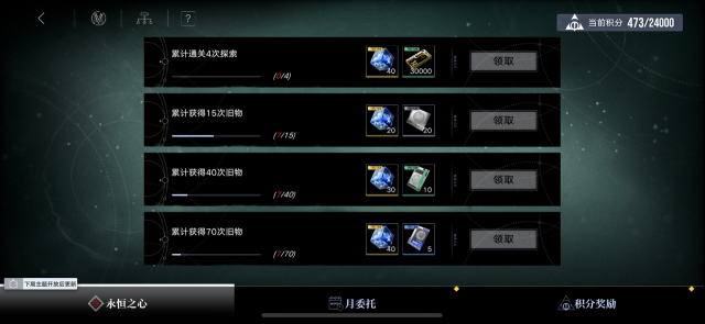 积分奖励为常驻存在,不会重置。领取奖励所需的积分可通过常规探索和完成月委托两种途径获得。积分存在上限,达到上限时将无法继续获得积分。