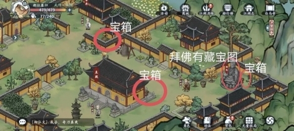 2、白马寺中间的房屋有一个宝箱,左边短墙内有一个宝箱,佛像后面有最后一个宝箱,并且拜佛有藏宝图。