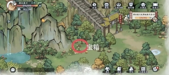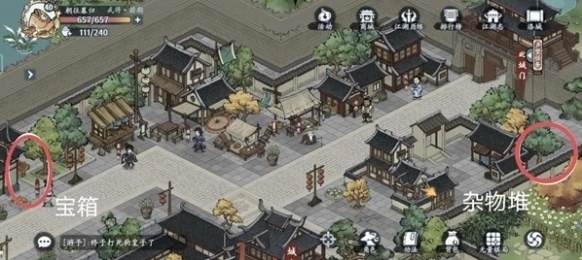 4、城外探索完成后就进城,在城门口以及左右两边发现宝箱,并且右边有一个江湖事件、左边有一个藏宝图。