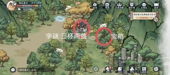 3、继续走下去可以在凉亭发现一个解谜和凉亭后面的宝箱,字谜是三杯两盏。