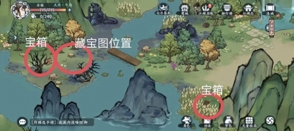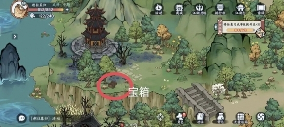 4、最后在河边的芦苇旁发现宝箱,过桥后在枯树旁边有一个宝箱,另外旁边还有一个藏宝图。