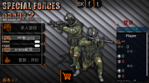 特种部队小组2是一款第一人称射击游戏,英文名叫Special Forces Group 2,作为该系列的第二部,其玩法和画风都和经典游戏CS相似,但是相比较于第一部的玩法模式,游戏在经典的复活、夺旗、僵尸模式之上还额外增加了爆破模式,可以充分满足大部分玩家的射击需求,可以说是每个游戏爱好者们的必备手机游戏。