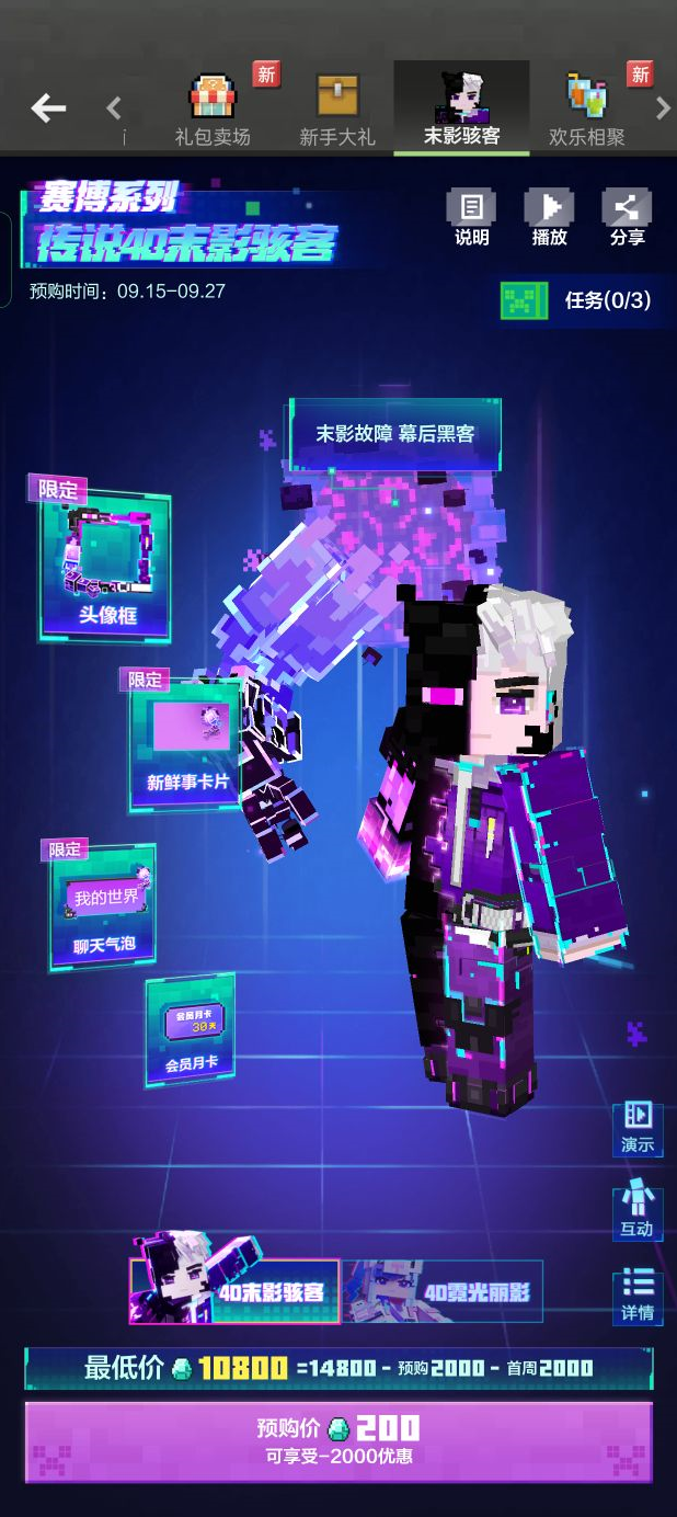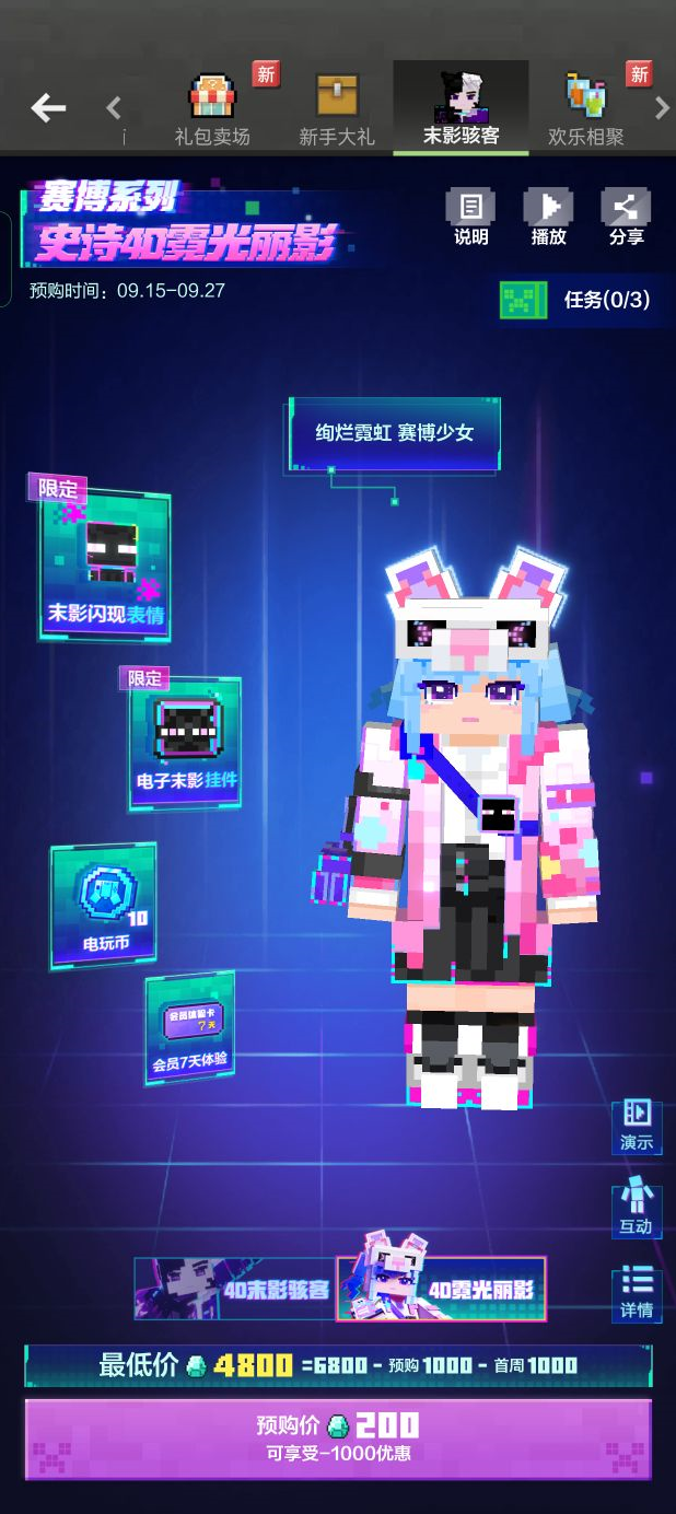 9月15日,赛博主题双皮肤礼包正式开启预售。9月15日至9月27日,冒险家们仅需花费200钻石即可享受3000钻石的购买优惠,还能获得4D末影骇客皮肤体验卡和4D霓光丽影皮肤体验卡及电玩币。上线首周更有立减3000钻石的超值折扣,想入手精美皮肤的冒险家千万别错过了!