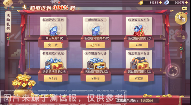 特惠锻造石礼包:含顶级锻造石*5,元宝*300,售价30元,活动期间限购2次。