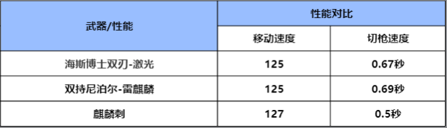 性能对比在性能方面移动速度和双持尼泊尔-雷麒麟相同,略低于麒麟刺,不过切枪速度在双持尼泊尔-雷麒麟和麒麟刺之间,这个差别在刀战模式并无太大影响,只会在其它模式切枪的时候稍微有一些影响,不过影响不大。