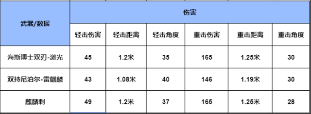我们可以从三款近战武器对比中看到,海斯博士双刃-激光的伤害介于双持尼泊尔-雷麒麟和麒麟刺之间,轻击距离和麒麟刺相同,轻击角度稍逊色其它两款枪械,而重击伤害和重击距离同样和麒麟刺相同,且高于双持尼泊尔-雷麒麟,在重击角度上略高于其它两款近战武器。