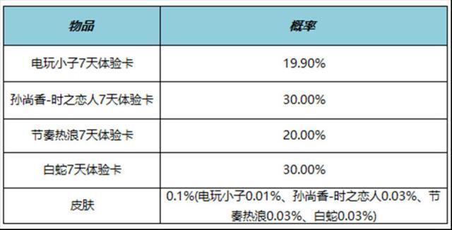打开后必得皮肤碎片x2、铭文碎片x100和以下随机奖励之一:皮肤或皮肤体验卡(7日)1张(鲁班七号-电玩小子、孙尚香-时之恋人、阿轲-节奏热浪、大乔-白蛇)