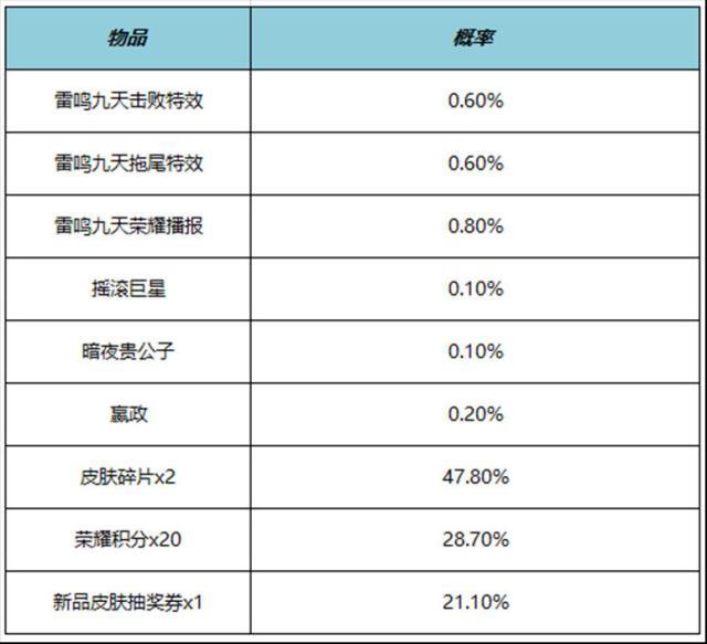 购买红蓝对决(1日),可额外获赠一个礼包,打开后可随机获得以下之一:嬴政专属击败-雷鸣九天击败、专属拖尾-雷鸣九天拖尾、专属播报-雷鸣九天荣耀播报、摇滚巨星、暗夜贵公子、嬴政、皮肤碎片x2、荣耀积分x20、新品皮肤抽奖券x1。累计150次必得全部局内特效。