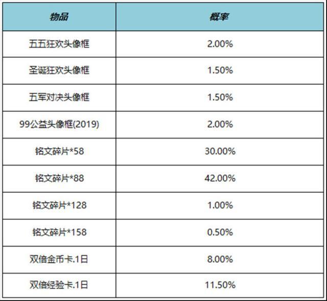 打开后可随机获得以下奖励之一:五五狂欢头像框、圣诞狂欢头像框、五军对决头像框、99公益头像框(2019)、双倍金币卡:1日、双倍经验卡:1日、铭文碎片x158/128/88/58。