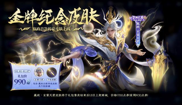 出自东方,冠绝亚洲,是王者也是金牌!为纪念杭州亚运会电子竞技项目首金荣耀,作为亚洲之巅金牌纪念皮肤”的嬴政玄雷天君,正式登场! 我们以”东方仙侠“为主题,结合国风设计,展现嬴政护佑人间安宁的形象–高贵威严,霸气自傲但又怜悯众生,心系天下。