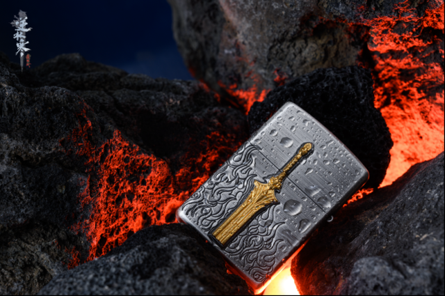 它另一特点就是“足够好看”:双面蚀刻了精细的火焰纹路,并制作了以剑为题材的鎏金徽章,显眼而不张扬。“咔嚓”伴随着清脆的开合点火声,可以瞥见侧边棱角分明的逆水寒Logo。所谓的品位与格调,就是从这一点点的小细节里展现出来的。
