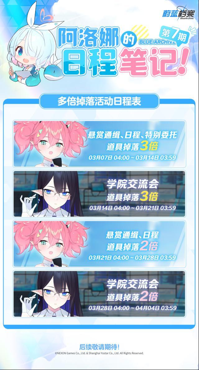 日程笔记仅供老师参考未来版本更新后活动内容及招募时间等内容,具体活动规则还请老师关注后续官方社媒及游戏内、官网的公告。下方附带了当期版本日程笔记长图,其中包含了期间的活动开放时间安排以及多倍活动的开启日程,以供老师参考~