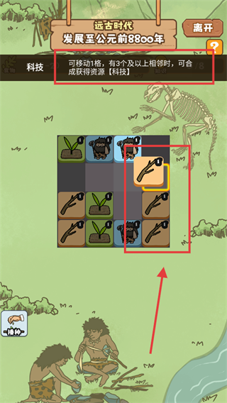 4、科技的合成规则为方块可移动【1】格,有【3】个及以上相邻时可合成获得【科技】资源;移动【树枝】方块,使其与其他树枝相邻凑足数量,即可合成获取资源。
