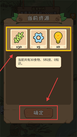 2、查看当前资源【食物】-【30】、【科技】-【5】、【知识】-【0】,点击【确定】按钮,进入文明发展的实际操作阶段。
