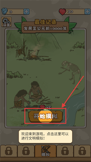 1、点击【开始模拟】按钮,即可开启文明推演进程,从原始时代开始推进文明发展。