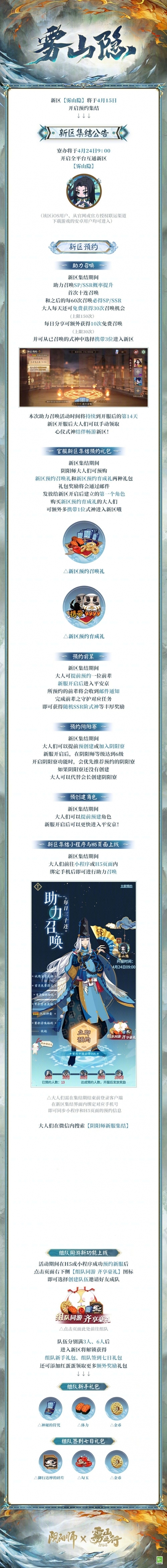 《阴阳师》全平台新区「雾山隐」4 月 15 日预约集结!4 月 24 日开服即享 30 日福利,登录领随机 SSR、新手月卡,更有雾山五行联动召唤、踏青行纪等活动同步开启!详细内容跟着小编一起往下了解全部吧