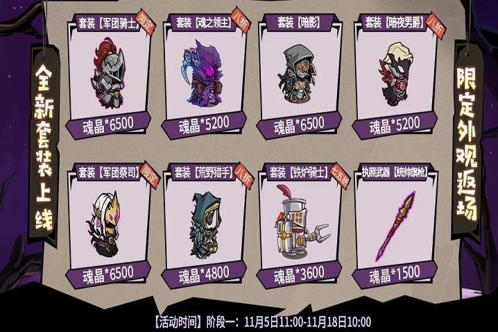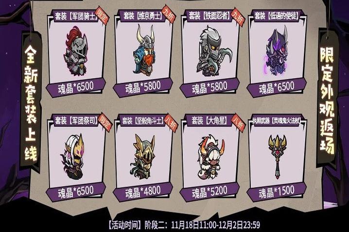 全新周年庆套装军团骑士、军团祭司,售价6500魂晶。此外,还有超多往期外观限时返场,宝藏猎人们不要错过啦!
