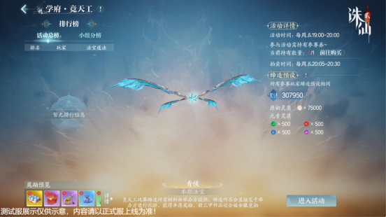 在此,系统将免费提供所有缔造材料,所有玩家使用统一的默认模板,全心比拼对炼宝之道的领悟。每人拥有两次机会,最终以法宝蕴含的“道法”论高低,仙友们仅需购买门票即可参与活动。