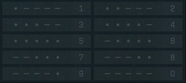游戏里会播放“短音(·)”和“长音(-)”,每四组为一组数字,中间有停顿并循环播放。对照以下表即可解码: