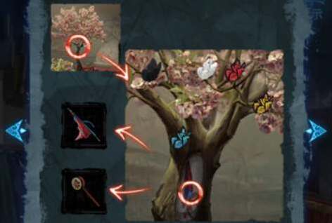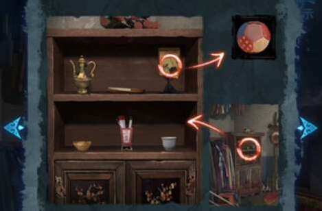 13、在仓库的木偶戏台中看小钟的手机获得线索,在戏台上根据木偶戏台的线索如图调整树上蝴蝶的位置与高度,拾取拨浪鼓和靠旗。