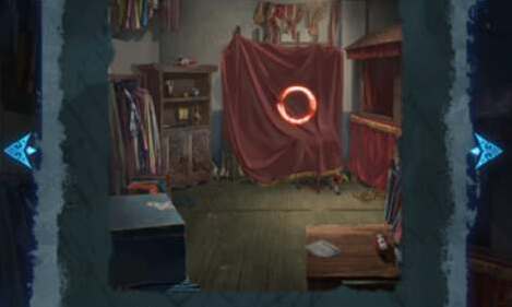 9、回到后台梳妆台用化妆笔染红色油彩,在门上的脸谱上完成一笔画后可以开启仓库的门。