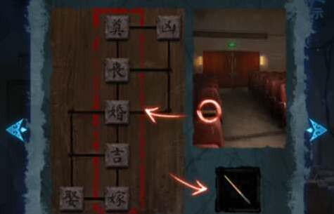 4、在戏厅的座椅上会发现四张脸谱,对应的座位编号就是密码“7153”,将这个密码输入到消防箱子处即可开启消防栓。