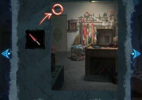 7、将获得的绣花鞋放到墓碑前的火盆中打开密室,在梳妆台上获得一张封条,使用纸伞将上方的电闸打开。