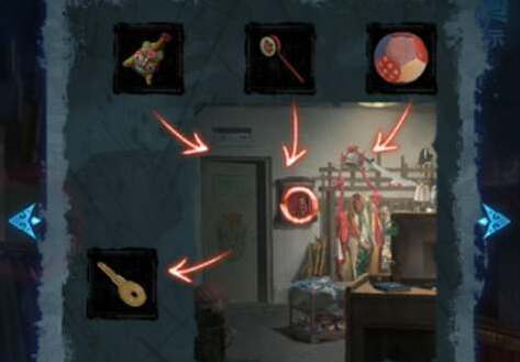 12、将布娃娃摆到后台的神龛上后获得新的线索,按线索将仓库陈列架上的戏曲道具如图摆放,可以获得玩具球。