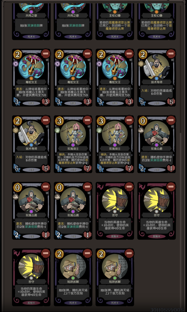 目前天梯上主流的阵容是亡魂,快攻龙,和快攻狼。苦守对付这三个阵容都用得上,所以我直接带了三张。苦守还可以假死规避亡魂的伤害,再加上暴君的斩杀线高,这套打亡魂可以达到82甚至91的程度。玫瑰剑士可以很好的防快攻阵容,不过有点看运气,所以只带两张。玫瑰公爵可以减手牌费用,降低斩杀线,其实两张就够用了。