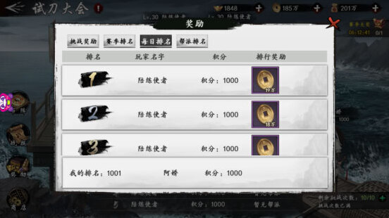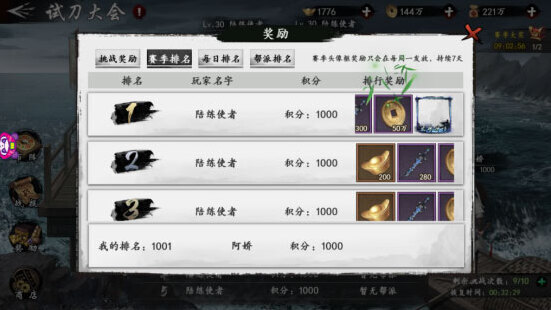 试刀大会以每周二到周三、周四到周五、周六到下周一为一个赛季。赛季首日早9点可以开始报名,每日23:00-23:30进行结算。挑战对手胜利后可以获得积分,对手将扣除积分。每个人赛季奖励结算后,积分将重置为初始积分1000点。