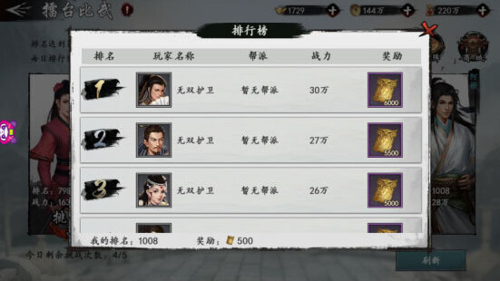 在擂台比武中,大侠可以选择心仪的比武对象并发起挑战。位于最右侧的是大侠自己的当前排名和战力。挑战对手前可以先行查看对方的战力和排名,这样才能知己知彼百战百胜。每日共有5次挑战次数,如果你对场上的四位对手不满意,还可以选择刷新,随机更换其他对手供大侠挑选。