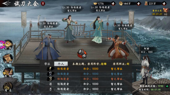 试刀大会挑战次数每小时回复1次,最多存储10次。每赛季都有各自的主题,会对部分阵营或职业进行禁用,大侠无法派对应的侠客进行出战。如本期禁用的阵营为射雕,禁用的职业为剑,如果准备不充足甚至有出阵人数不足的情况发生。所以大侠一定要扩充自己的侠客数量,这样才能有备无患。