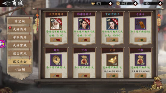 试刀大会中会产出残刀道具,可以凭此在试刀大会商城中兑换奖励。包括天竺僧碎片、耶律齐碎片、丁敏君碎片等。其中部分奖励仅在历史排名达到指定名次时,才能限购该奖励。建议大侠们优先兑换限购奖励,这些奖励的性价比极高,即使暂时用不上也可以低价购买以备不时之需。限购兑换完毕后建议优先兑换武将碎片,按照稀有度从高到低的顺序进行兑换。