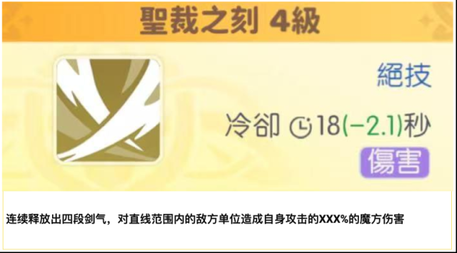 加百列的小技能,可以随着共鸣等级提升。技能路劲内的目标均可受到伤害,不会因为人数衰减,4段剑气伤害分开结算。享受恩赐状态加成,伤害也非常不俗。奥义CD时主要靠此技能打小爆发。