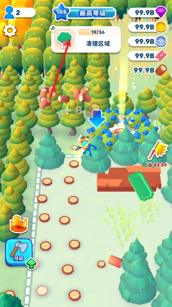 1、进入游戏后,拖动屏幕即可进行移动,靠近树木后即可砍伐树木获得资源。