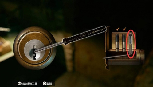 7.撬锁时,转动撬锁工具,当锁销发白光手柄会震动,说明撬锁工具的位置对了,保持这个位置一会儿这个锁销就会固定,撬锁后进去拿钥匙。