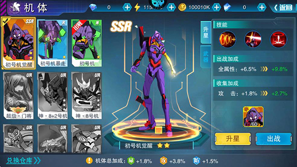 1、游戏内机体分为SSR、UR等品质,UR机体为顶级战力,通过升级可提升机体等级,解锁更强属性。