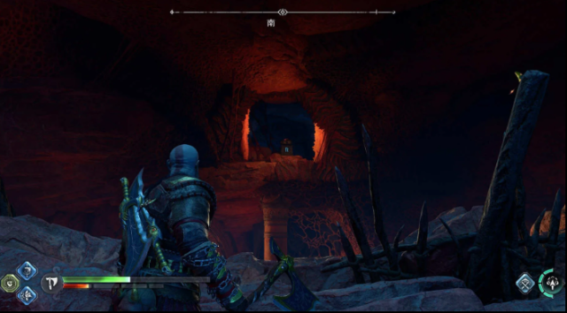如图所示位置可以看到宝箱,R在宝箱旁,我们先去宝箱右边的通道,使用黄昏石打N,往宝箱左边走几步,右上方可以找到C。