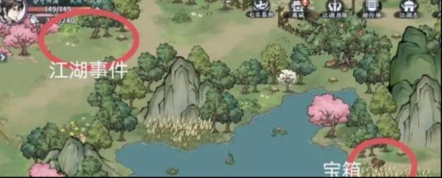 5、宝箱在中间,每日供奉和藏宝图在树下,还有一个宝箱需要点击山洞触发剧情,山洞里还有一个藏宝图。