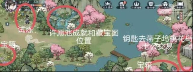6、试炼在左上方,宝箱一个在左下一个在右下,许愿池成就和藏宝图在右上,右下的钥匙去燕子坞桃花岛找七公交易。