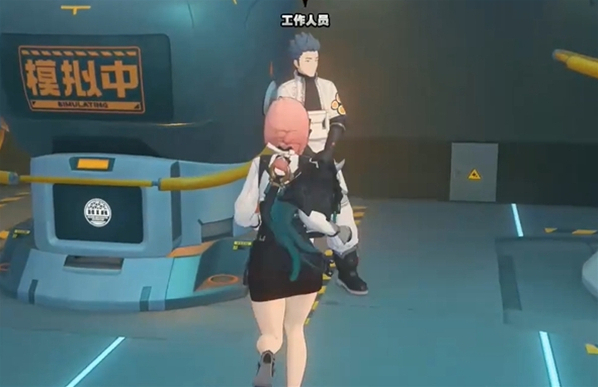 6、进入玻璃门后,你会遇到另一位工作人员。与他/她对话并进行进一步的互动,最终你将需要登录到一个VR虚拟机中。VR虚拟机将带你进入一个全新的虚拟空间,开始剧情任务。