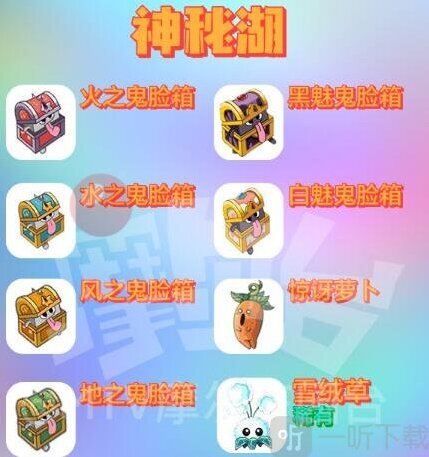 火之鬼脸箱、黑魅鬼脸箱、冰之鬼脸箱、自魅鬼脸箱、风之鬼脸箱、惊讶萝卜、地之鬼脸箱、雪绒草、浆果丛林、电波兔、拉拉美