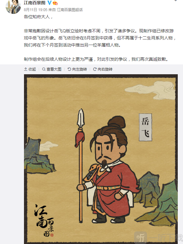 为此,江南百景图官方也是连夜修改了闲人岳飞的模型,还原了岳飞形象。