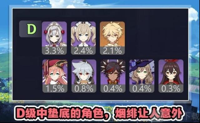 最后这些大多数就是真的角色强度相对拉夸的和没有多少人练的角色了。像女仆烟绯强度其实还可以,但是用的人很少,烟绯就是低配版的可莉,但是手感比可莉好很多,输出也不低,但是热度很低,都不如龙爷