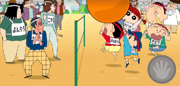 8、当球落到蜡笔小新的头上时,点击按钮。