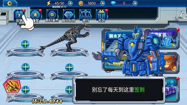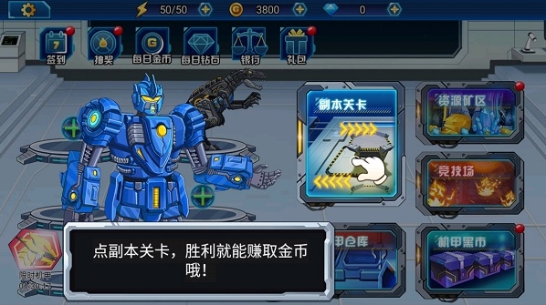 4、想要快速提升机甲战力,部件的购买和升级是必不可少的,现在你可以通过签到、抽奖、每日金币、每日钻石、银行和礼包,甚至包括游戏模式中的资源矿区来获得。